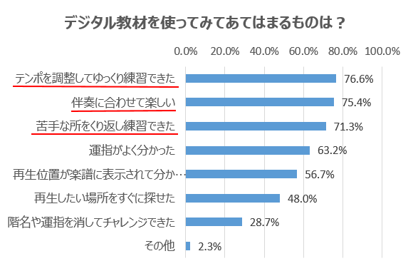 ◎デジタル教材は普段だと授業中に2~3回しか聞けない曲を何回も聞くことができてとてもよかった。そして、テンポも調整できるのでできないところのテンポを遅くして、何回も練習ができた。クラス全体だと追いつけない所を個人で練習できるのはうれしかった。