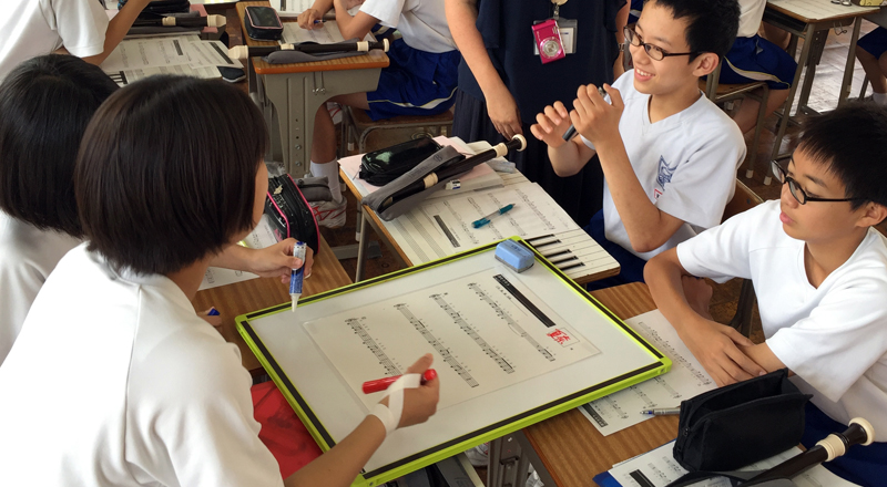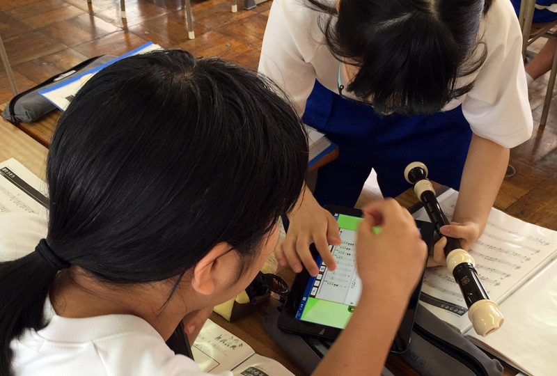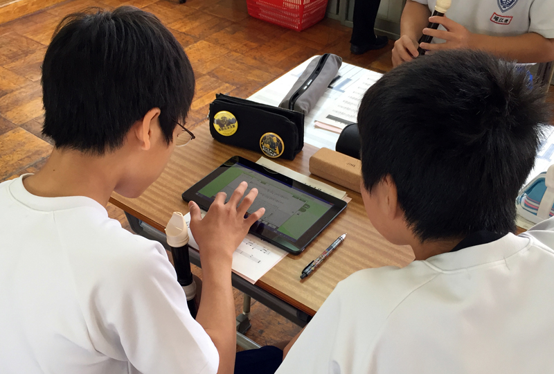 一班に一台のタブレットが配られ、デジタル音楽教材を利用して何度も繰り返しながら練習します。デジタル音楽教材には、楽譜に連動して運指が表示される機能があり、リコーダーが苦手な生徒でも視覚的に確認しながら練習を進められているようでした。また、テンポ変更機能を使って難しいところのスピードを遅くしたり、リピート機能を活用して繰り返し練習したり、自分達のペースで学習を進めていました。伴奏を再生しながら練習できることから飽きることなく、ほぼすべての班が集中して練習に取り組んでいたことには大変驚きました。
