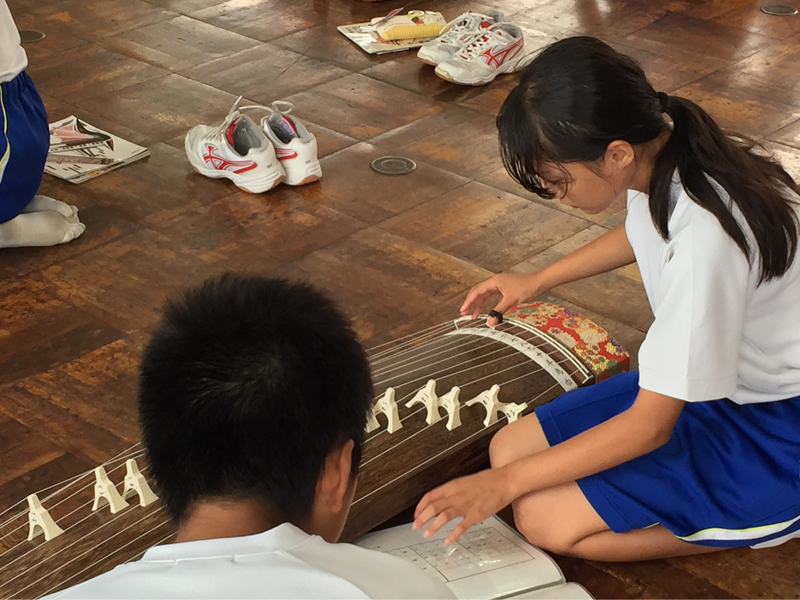 デジタル音楽教材の監修者でもある静岡大学の長谷川慎先生をゲストティーチャーにお招きして、箏の指導をしていただきました。 最初に、生徒たち全員による「さくらさくら」の演奏を聴いていただきました。 長谷川先生はこれまでにも多くの小中学校を訪問されてきましたが、「弱々しい音色になってしまうことが多いが、これほどしっかりとした良い音色で弾けているのは素晴らしい!」と、デジタル教材を使って箏演奏の基本がしっかり習得できていることを褒めていただきました。 長谷川先生は「唱歌」を使って、拍の取り方、裏間の取り方を指導されました。西洋音楽での拍の取り方と日本伝統の音楽の拍の取り方は違うこと、日本の伝統音楽では「裏間」と言って、裏拍が非常に重要であることをレクチャーしておられました。 また、「コロリン」を例に、唱歌の歴史や唱歌が持つ意味などについても話されていました。「コロリン」と言葉で話すのと同じように、「リン」が大きくなったり重くなったりしないように弾く。「コロリン」というフレーズが持つニュアンスのまま、箏で弾いてみる練習を繰り返し行いました。 「コロリン」は、箏初心者にとっては難しいテクニックの1つですが、それでも生徒たちは繰り返し練習することで滑らかに弾けるようになっていく様子が見られました。