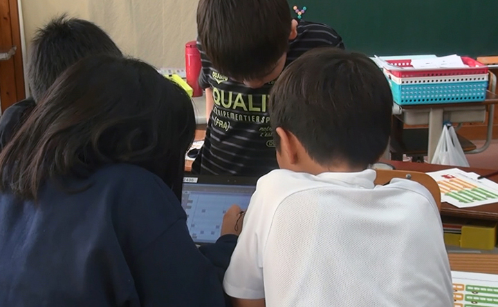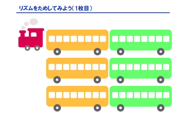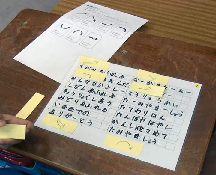 3〜4人のグループにわかれ、計4グループがそれぞれ16小節の曲を作っていきます。最初に、初めて使うボーカロイド教育版の操作説明を受けます。音の入力、修正の方法などを知ることに加え、1小節が8マスに分かれていることに気がつきました(※初期設定、音符の長さは随時変更可能)。つまり1マスの長さが8分音符で、その音符に言葉を乗せていくので、1小節の中には8文字の歌詞が入ることになります。さらにその歌詞の言葉を伸ばしたり、休符を入れてリズムを作ることを想定し、7文字+5文字、七五調の「やさしいせんせい+ありがとう」という言葉で、入力とリズムの作り方を練習しました。ここではボーカロイド教育版に同梱されている授業モデルパックにあるワークシート「リズム記入表」を使います。2小節分の歌詞ですが、言葉を伸ばす位置や休符の位置で聞こえ方が変わるため、グループでアイディアを出し合いながらリズム作りを行いました。記入したマス目と同じようにボーカロイド教育版にリズムを転記して行くので、一度の練習だけで児童たちはすぐに使い方に慣れていきました。
